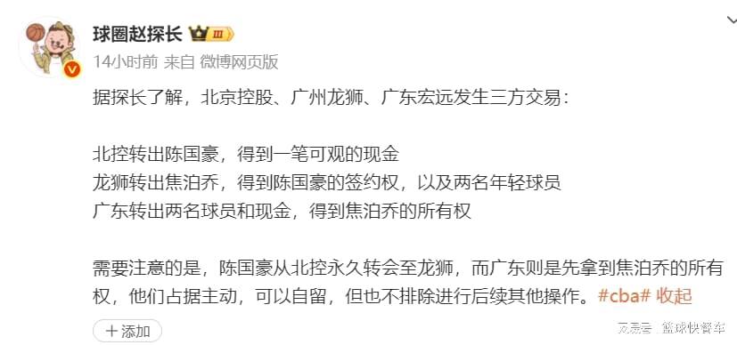 CBA漫长的休赛期终于又有活力了。根据知情人士透露,广东、广州以及北控将联手三方交易,这一次交易到三方四人,堪称是CBA今夏迄今为止最大的交易。北控送出陈国豪后,将得到一笔可观的现金,而广东队则送出一笔现金以及两名年轻球员,得到了焦泊乔的所有权,广州队在送出焦泊乔后,他们则收获了陈国豪以及两名年轻球员。从这一笔三方交易上来看,北控是稳赚不赔,是广东队却可能亏大发了。